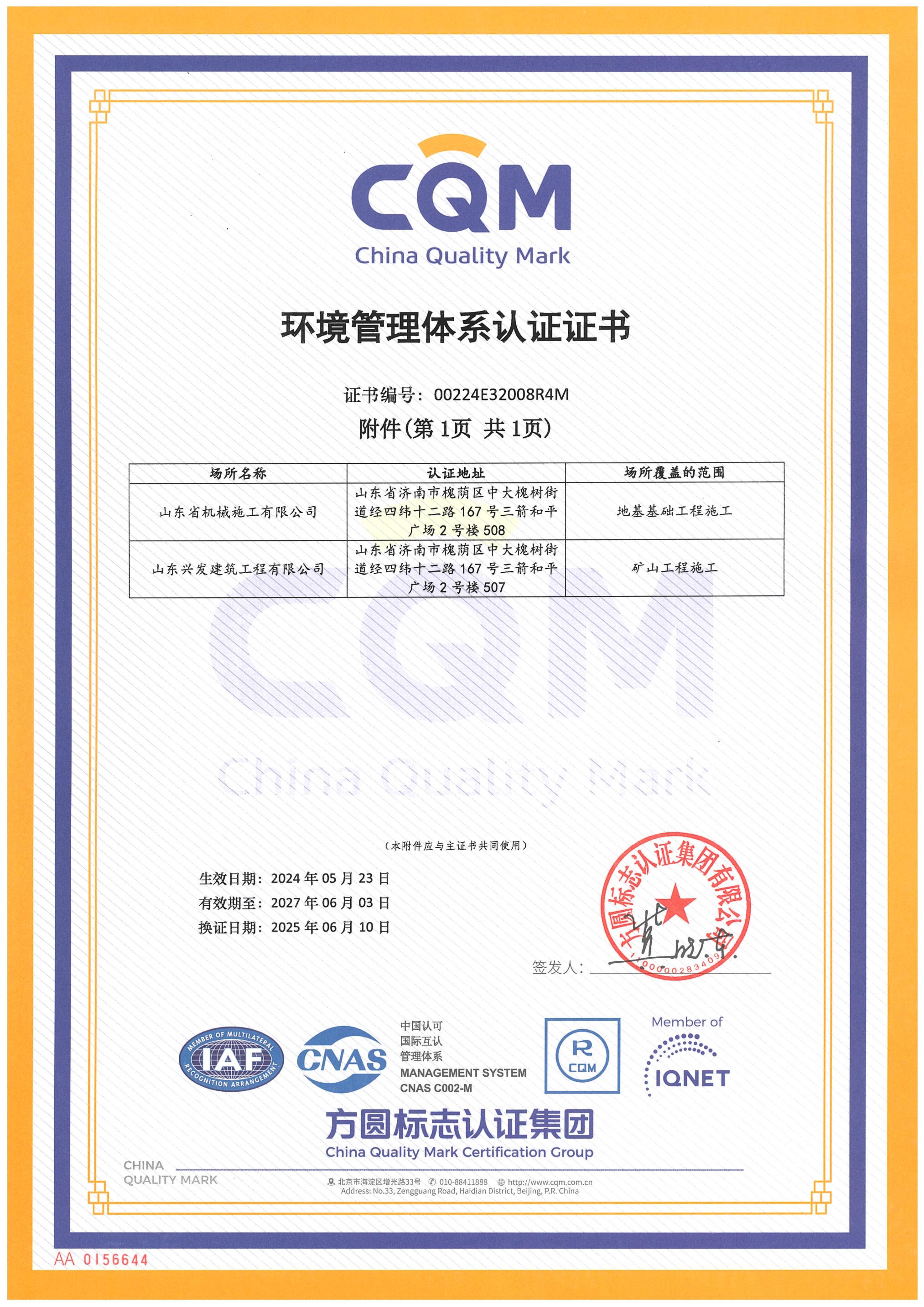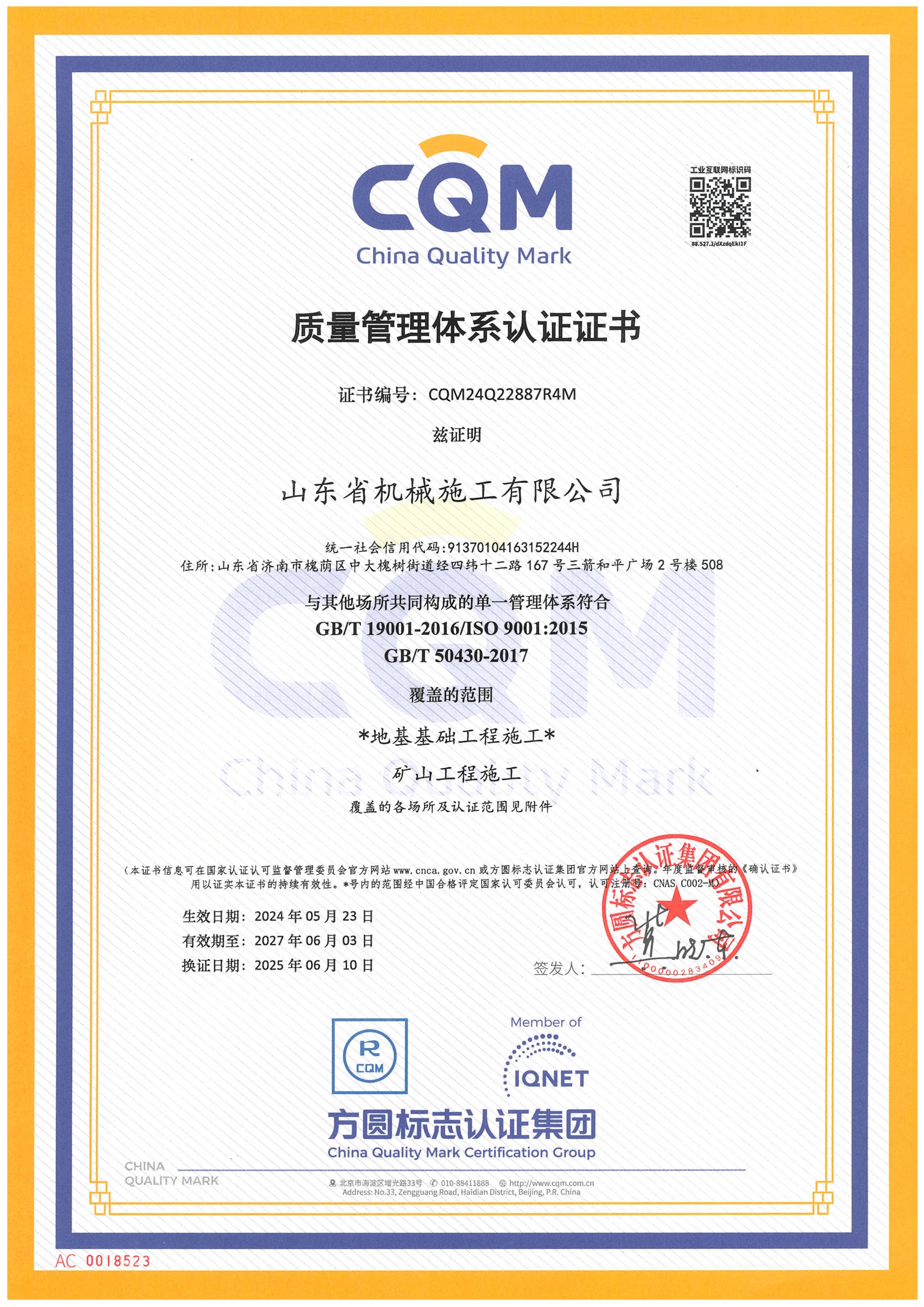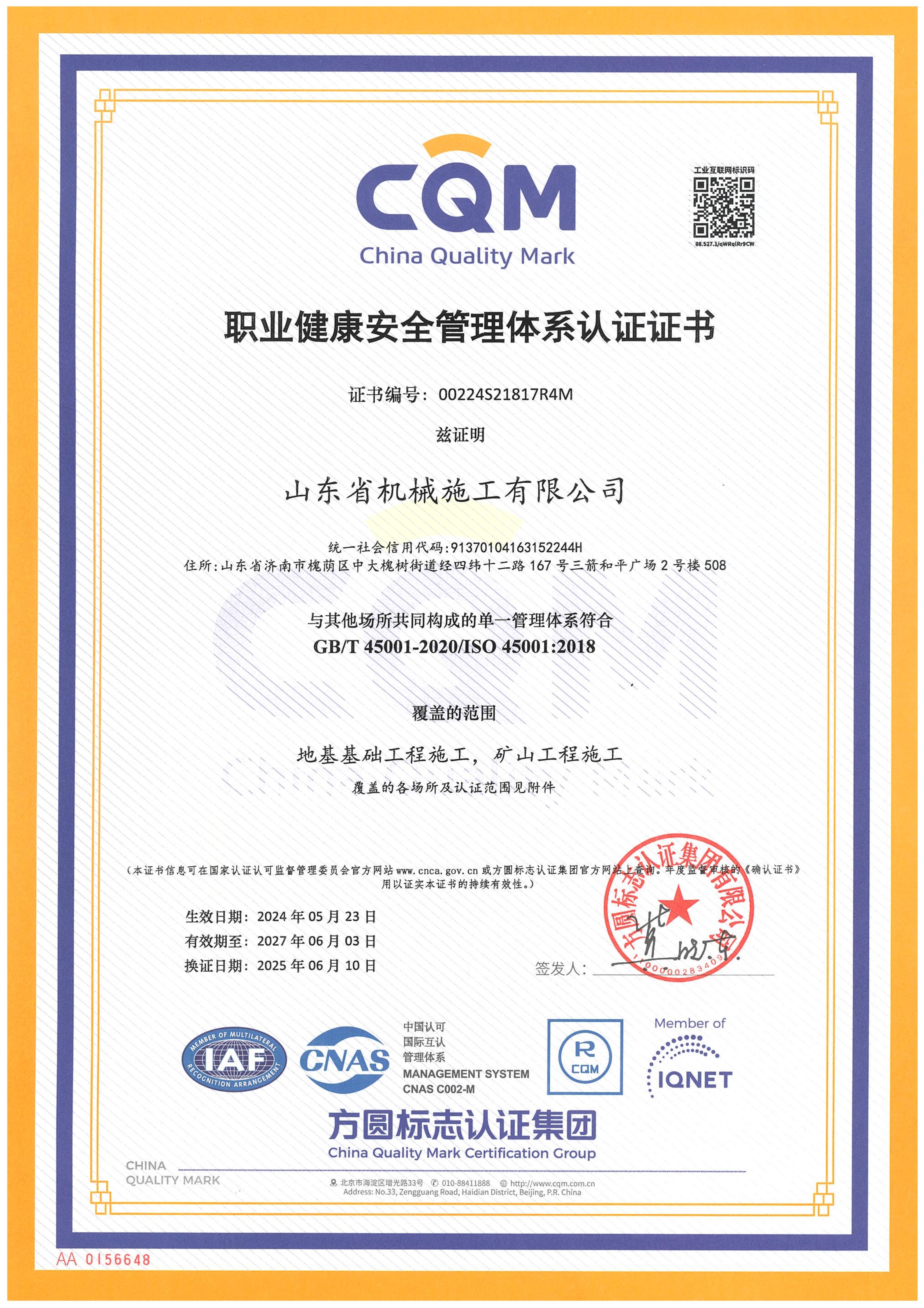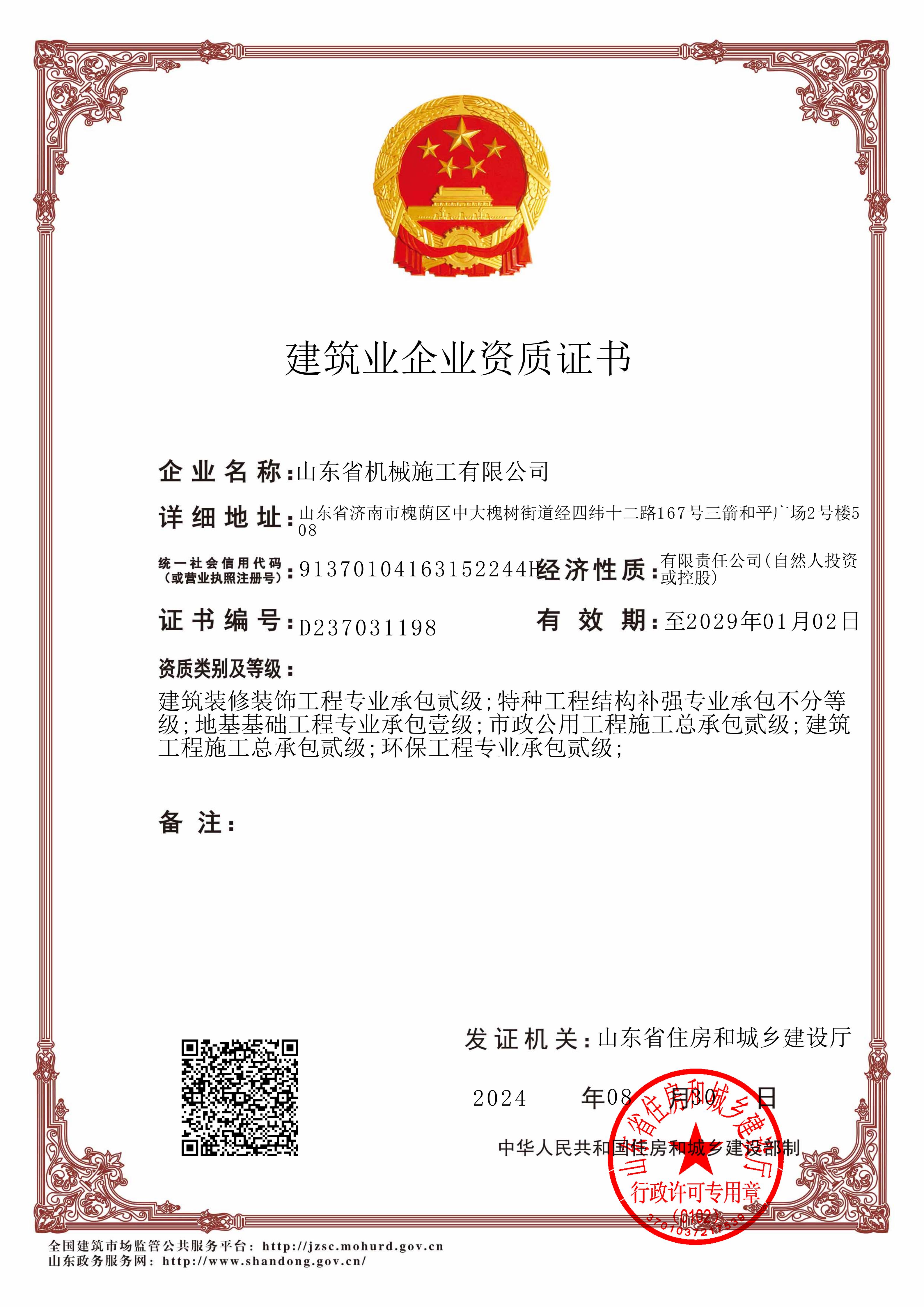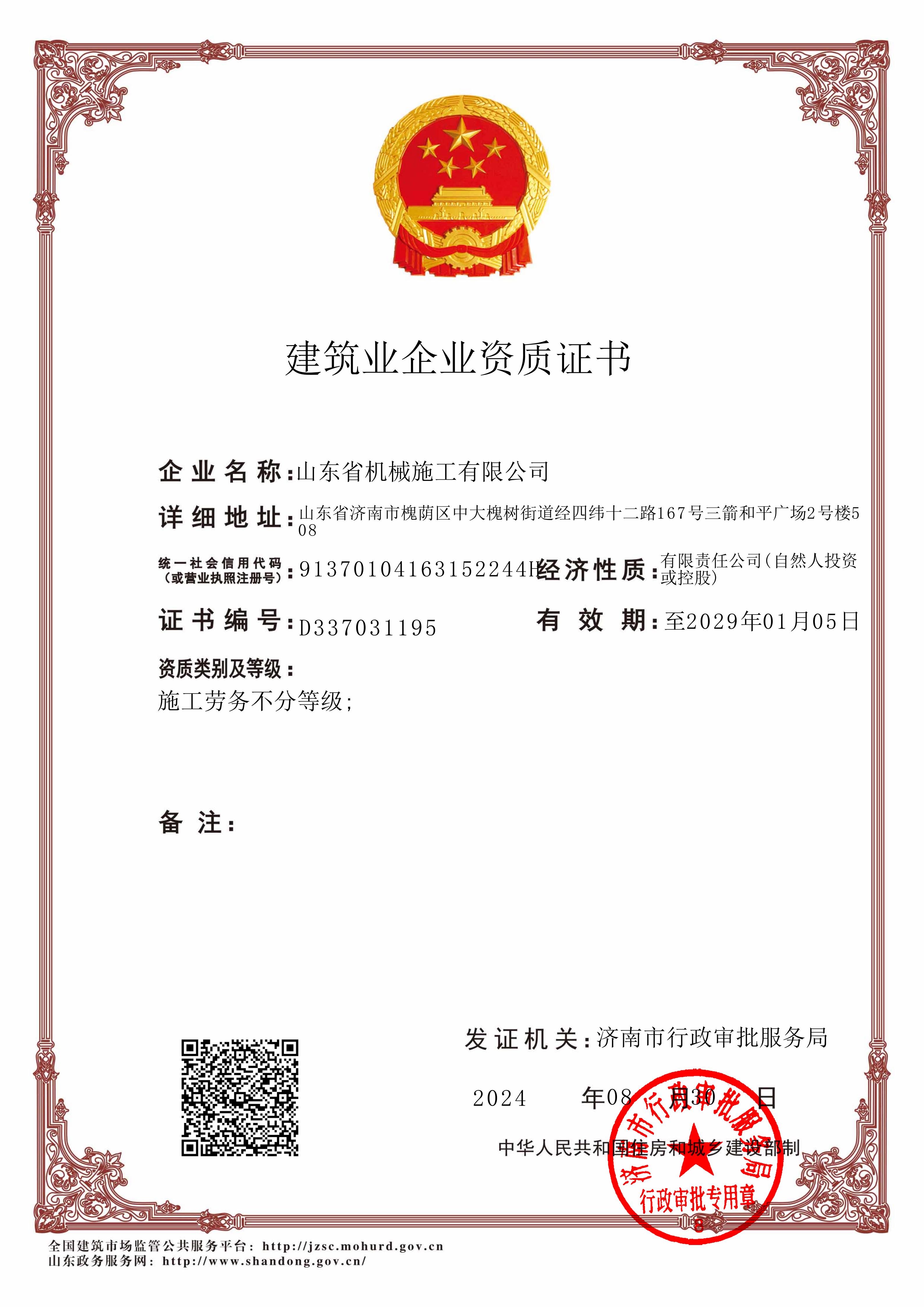 山東省機械施工有限公司資質(zhì)證書